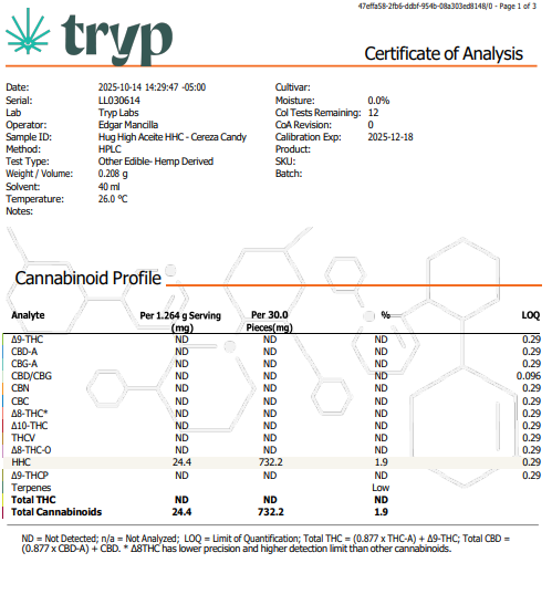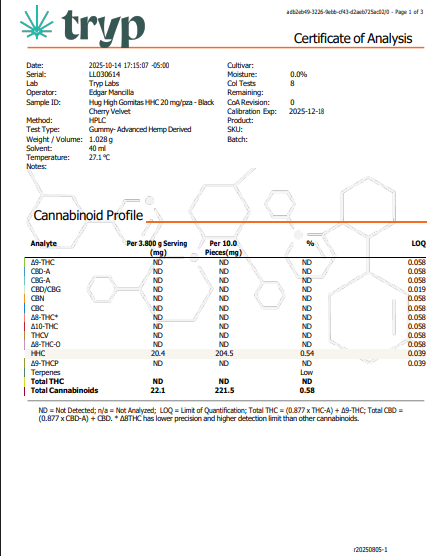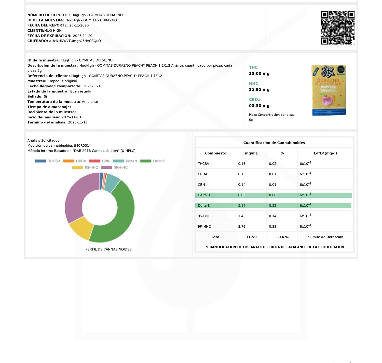 Gomitas con 30 mg de D8 + 20 mg de HHC por pieza.